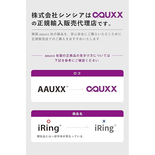 【製品と正規代理店について】 本製品は、韓国メーカーAAUXX社が生産する正規品です。株式会社シンシアは、iRingシリーズの日本正規代理店として、お客様に安心と信頼の製品を提供しています。製品に関するご質問や、万が一の不具合の際も、充実したサポート体制を整えておりますので、どうぞご安心ください。