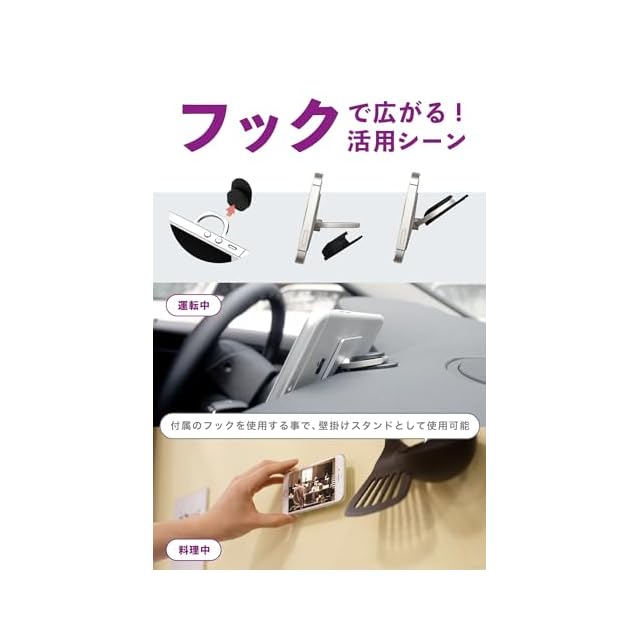 【便利なフック付属】付属の吊り下げフックを使えば、iRingを装着したスマートフォンを簡単に掛けることができます。車載ホルダーとしてだけでなく、キッチンやデスクなど、様々な場所で平面に装着して活用できます。