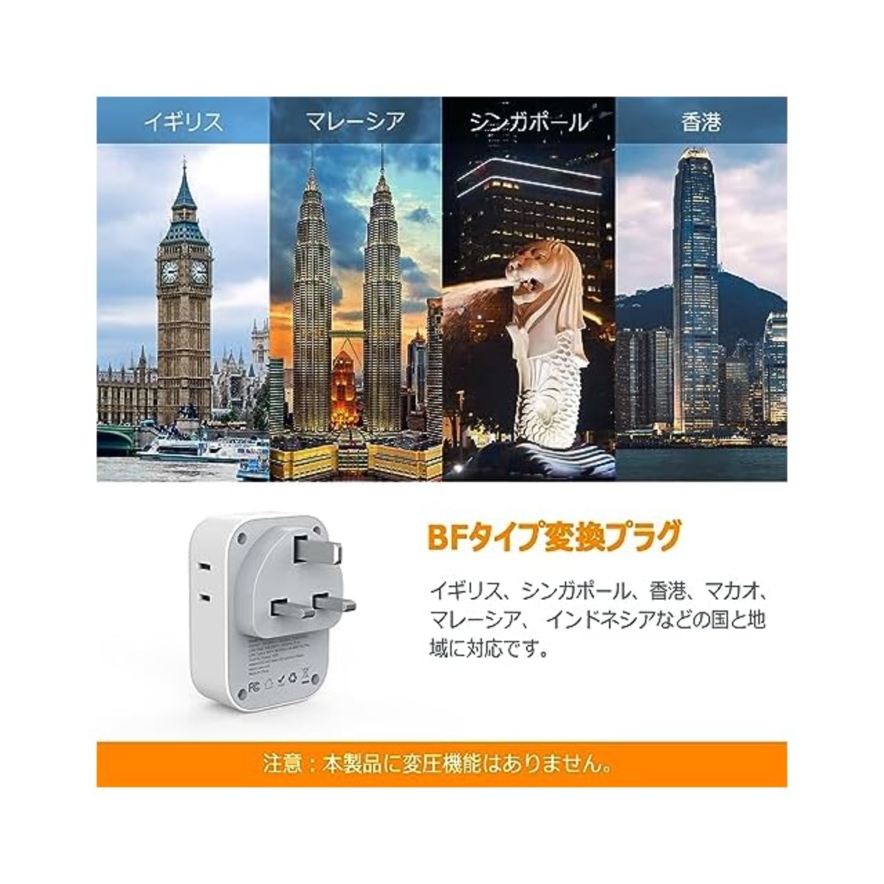 出張者や旅行者の生活をより快適にするために設計された海外向けBFタイプ変換プラグです。このマルチ変換プラグは難燃性ユリア樹脂を採用し、電気火災の防止に有効。4つAC差込口、2つUSB-Aポートと一つUSBポート-Cポートが付いており、7台デバイス同時に充電できます。イギリス、香港、シンガポール、マレーシア、 インドネシア、アイルランド、ドバイなどの国への出張や旅行する際に役立ちます。