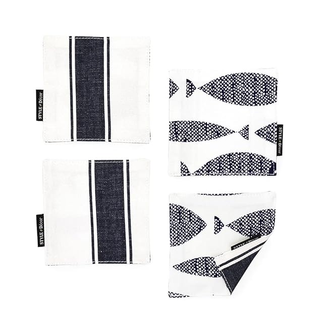 スタイルデコール(STYLE Decor) コースター リバーシブル おしゃれ 布 4枚セット 洗える 北欧 マリン ネイビー さかな フィッシュ W3000520