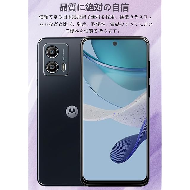 【対応機種】:Motorola moto g53j 5G / moto g53y 5G 対応注意:この電話の画面の端は湾曲しているため、保護フィルムのサイズが丁度良い場合、しっかりと貼り付けられず、白いエッジやシェルとの干渉などの問題があるため、保護フィルムは画面よりも小さいです【日本旭硝子素材採用・圧倒的な耐衝撃性・飛散防止】徹底的にこだわった品質、信頼できる日本製旭硝子素材を採用、通常ガラスフィルム などと比べ、強度、耐傷性、質感のすべてにおいて優れた性質を持ちます安心してご使用いただけるように、一枚一枚、手作業で検品しておりましたまた、Motorola moto g53j 5G / moto g53y 5G ガラスフィルム卓越した耐衝撃性能を持って、落下への衝撃からしっかりと保護万が一強力な衝撃でガラスフィルムが割れてしまっても、破片の飛び散りを防ぐ飛散防止コート処理で、画面をしっかり保護、スマートフォン をよく保護できます 【滑らかな触り心地・高透過率】:0.26mmの極薄ガラスを使用、スクリーンを元々の高感度タッチを保ちます高感度のフィードバックで遅延なく、100%正確迅速な対応できます、スムーズな操作感を実現できます99%透過率で、透明度が普通の moto g53j 5g / moto g53y 強化ガラスフィルム よりも高くて、液晶画面を守りながらスクリーン元々の明るい画質を損なわなく、ディスプレイに色鮮やかを再現 【疎水性・撥油性拔群】:極薄ガラスフィルムに高耐久撥油コーティングが施され、汚れや油分をはじき、指紋がつきにくく、付着した汚れなどは簡単に拭き取れますmoto g53j 5g ガラスフィルムに強粘着性、自動的に吸着し、気泡に悩まされることなく、より簡単に、より綺麗に液晶保護フィルムを貼り付けることができる高精度加工の2.5Dラウンドエッジをしており、スマホの湾曲した部分にピッタリとフィットし、一体感のあるデザインとなっています 【露出過度防止・カメラを保護】:レンズフィルム上の独自の露出防止リング、撮影時の露出オーバーを効果的に防止し、高画質な画像が得られます撮影時に影響をおよぼさない透明度の高い保護フィルムですフラッシュで撮影の際に、光がカメラに影響を与えない、被写体や風景の明るい部分の露出を保ち、写真や動画の白飛びを防ぐことができます四角い台座まで覆って、全体を密着して保護しながらカメラレンズの中にホコリの巻き込まれも防止します 【気泡防止・貼付け簡単】:気泡防止加工が施されているので、気泡が入りにくい万が一気泡が入ってしまっても時間が経てば徐々に抜けるので 美しい仕上がりにガラスを液晶に置くだけで自然に吸着、簡単に気泡が抜いて行くので、誰でも簡単、綺麗に貼ることができますフィルム貼りことが苦手の方でも簡単に貼る事が可能です(ご不安な場合は、お気軽にお問い合わせ下さいませ)