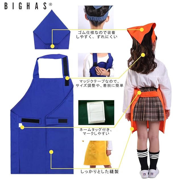 エプロン、三角巾、巾着バッグの3点セットです。エプロンは子供でも着脱やサイズ調整が楽なマジックテープ仕様、三角巾は装着しやすく、ずれにくいゴムタイプになります。