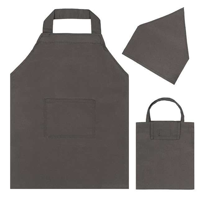 [BIGHAS] キッズ エプロン 3点セット 子供 三角巾 巾着バッグ 無地 男の子 女の子 色落ちしない ホコリが付きにくい (ダークグレー, 高学年用(140~160cm) L)