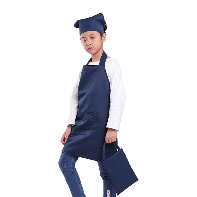 [BIGHAS] キッズ エプロン 3点セット 子供 三角巾 巾着バッグ 無地 男の子 女の子 色落ちしない ホコリが付きにくい (高学年用(140~160cm) L, ネイビー)