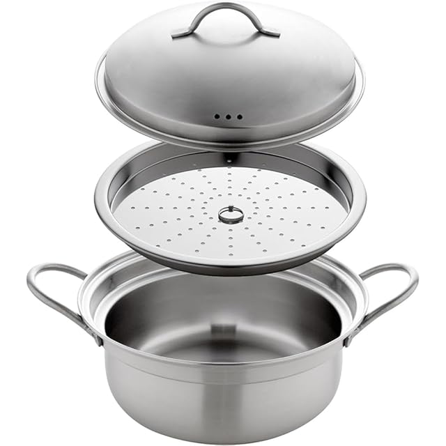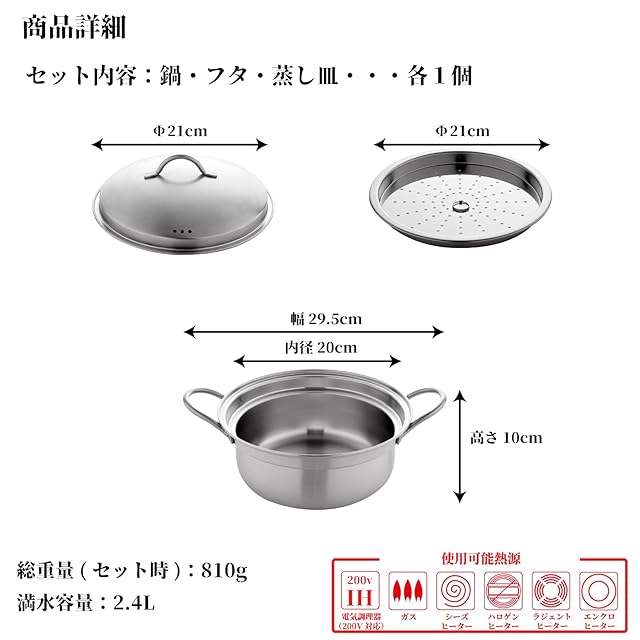 ●セット内容:鍋本体、蓋、蒸し皿、取扱説明書●本体サイズ・重量(約):鍋本体/幅29.5×奥行22×高さ10cm(520g)、蓋/直径21×高さ6.5cm(190g)、蒸し皿/直径21×高さ2cm(100g)●内径(約):20cm●満水容量(約):2.4L●底の厚さ(約):0.7mm●材質:ステンレス鋼●原産国:日本(新潟県燕三条)