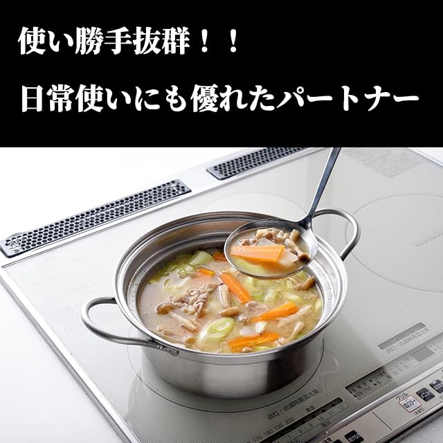 【軽くてにおい移りしない土鍋】ステンレス製で軽く、土鍋のように落としても割れない扱いの良さが特徴です。色やニオイが移りにくいので、キムチ鍋やカレーなども汚れが残らず清潔に使えます。