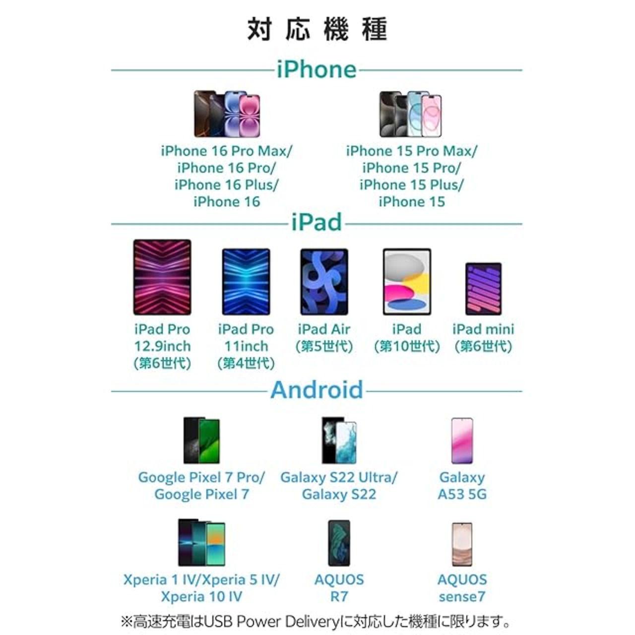 USB Power Deliveryに対応しています。iPhoneを約30分で50%まで充電できるから、外出先でスピード充電が可能です。