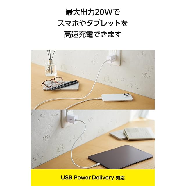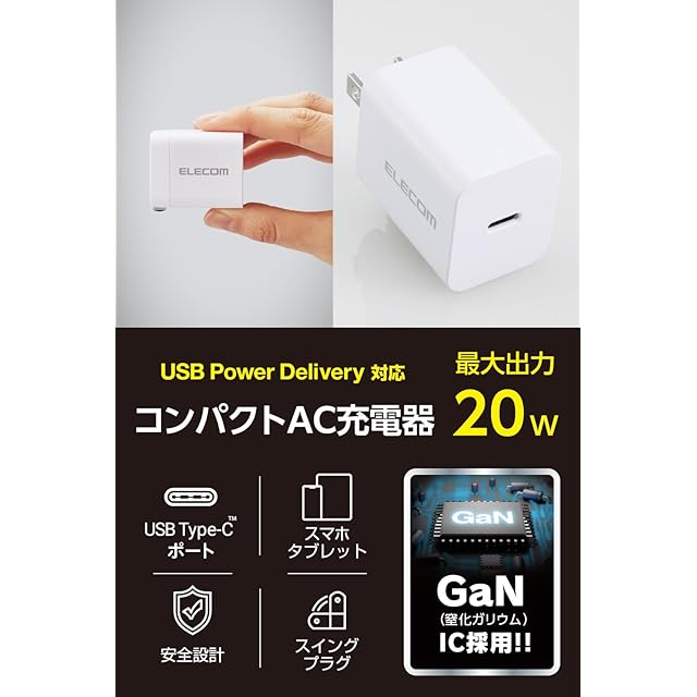商品名:エレコム 充電器 Type-C USB-C 20W USB PD対応 1ポート PSE認証品 GaN採用 折りたたみ式プラグ ホワイト 【 iPhone16 15 等対応】 EC-AC6820WH