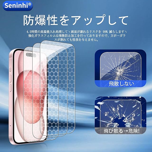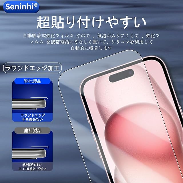 【Seninhi】iPhone15 plus 保護フィルム最新登場!!!<br><b> <br><b> <br><b>について: iPhone15 ガラスフィルム <br><b>【割れにくい強化素材】</b> <br>2倍強化テクノロジー" を採用している、4時間以上強化処理を経て、市販の強化ガラスと比べ2倍の強度を持ています。 <br><b>【飛散防止】</b> <br>万一割れてしまったとしてもガラスが飛び散らずにより安全に処理できます。 <br> <br><b>【鮮明の画面】</b> <br>装着しているのを忘れるほど、高い透過性があります。 デバイ <br>スが持つ高精細な画面の美しさはそのまま! 携帯電話本来の画面を楽しむことができます。 <br> <br><b>【滑り抜群】</b> <br>さらさら手触り! <br>優れたウィンドウディスプレイを持ち、指滑らかで、好感度で快適操作。 <br> <br><b>【国産旭硝子製】</b> <br>世界最先端のテクノロジーを誇る旭硝子社製のガラスフィルムです。 <br>鍵やナイフなど鋭利なもので切りつけても傷がつきにくいガラスフィルムです。 <br> <br><b>【指紋防止、コーディング耐油】</b> <br>汗や汚れがついても拭き取るだけ。簡単なメンテナンスで携帯電話の液晶を常に綺麗に保つことができます。 <br> <br><b>【パッケージ内容】</b> <br>強化ガラスフィルム ×2<br> 強化カメラフィルム ×2<br>ホコリ除去シート×4 <br>スクリーン清潔ツール ×4 <br>取扱説明書 ×1<br><br><b>【カスタマーサービス】</b> <br>商品使用中、「通常使用で割れてしまった」や「空気が入ってしまった」などの場合。 <br>全ての品質上の問題とも弊社にご遠慮なく連絡ください。なお、対応の際に、お写真や現品にて不具合確認を取らせていただきます。 <br> <br><b>【ご連絡の方法】 <br>アカウントサービス内の「アカウントサービス」→「注文履歴」→「販売元」→「質問する」から、お気軽にお問合せ下さい。 <br>スムーズに問題を解決するため、不具合の写真とご注文番号を添付してご連絡をお願いいたします。 <br> <br> <b>◆Seninhiについて◆ <br>Seninhi——業界で先頭を切って簡単な張り付け方法を研究し、自動吸着、ガイド付きなどの風潮を助成しました。 <br> <br>長年にわたって、私たちはずっと堅守して初心を忘れず、高品質の製品を安定提供するために技術開発に絶えず挑戦し、 <br>事業資金の大半を商品開発とアップグレードに投入しております。 <br> 私たちは、お客様の要望に応え、十分満足いただけるような魅力ある <br>サービスと、安心で良質な製品の提供ができるよう努めます。