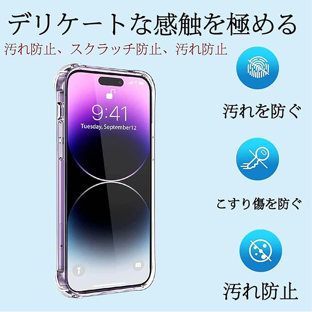 【Seninhi】iPhone 14 Pro クリアケース最新登場!!! <br><b> 【仕様】 <br><b>対応機種:iPhone 14 Pro 用クリアケース <br><b> (ご注意:ご購入前機種をよくご確認くださいね。間違った機種の購入による使えないことを避けてください。) <br><b> iPhone 14 Pro ケース スマホケースを選ぶ理由 <br><b> 高靭強化TPU素材: <br><b> iPhone 14 Pro 保護ケース全体は高品質の高靭強化TPU素材でできています。 <br><b> 【梱包内容】 <br><b> 1* iPhone 14 Pro ケース <br><b> 【製品の機能】 <br><b> ☑ 抜群な一体感 <br><b>この携帯カバーは人間工学に基づいた一体型デザインを使って、完璧なフィット感と抜群のグリップ力を実現しました。 <br><b> <br><b>側面に人間工学に基づいき、携帯電話をしっかりと手に握り、滑り止め、片手でも簡単に操作できます。 <br><b> 360°全面保護: <br><b>前面と背面を高くすることで携帯を保護し、磨耗や擦り傷を防ぎます。本ケースの角には落下時の衝撃を吸収するエアポケットを備えており、万が一スマホを落としてしまった場合でも、落下時のダメージを限に抑えることが可能となっており。 <br><b> ☑ 四隅エアクッション&念入りな保護 <br><b>四つのエアスペースクッションコーナーあり、外部からの衝撃を吸収し、落下、衝突、衝撃、擦り傷、その他の損傷からご愛機を強力に保護します。 <br><b> ☑ 3倍の衝撃吸収能力 <br><b>ケースの端とコーナーは特別に強化されており、日常生活で起きうる落下の衝撃をに吸収できます。 <br><b> ☑ カメラ保護: <br><b>保護ケースは iPhone 14 Pro の液晶画面やカメラレンズよりも約1.5mm高く設計し、日常の磨き傷を防止します。 <br><b> ☑脱着簡単: <br><b>高品質TPUを採用、柔軟性に優れて変形しにくく、脱着がとても簡単になり、本体との擦れ傷を防げます。 <br><b> ☑ ワイヤレス充電対応: <br><b>柔らかいTPU素材を採用し、厚さはわずか1.35mmで、スマホに似たような手触りを感じることができ、持ち心地も快適です。薄型なので携帯ケースをつけたままでもワイヤレス充電ができます。 <br><b> ☑ 黄変防止・指紋防止: <br><b>この携帯ケースは高品質なTPU素材を使用し、酸化を防ぐ特殊加工を使って、黄ばみにくく、透明感を長時間保持します。
