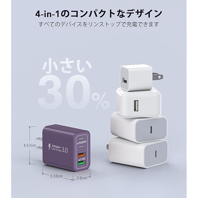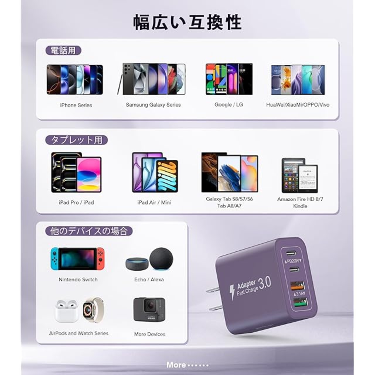 商品名:iPhone 17 充電器 20W PD USB 急速充電 【PSE技術基準適合/旅行に最適】ACアダプター スマホ充電器 USB 電源タップ iPhone、 iPad 、Android、Galaxy、Xiaomi、HuaWei各種対応(パープル)