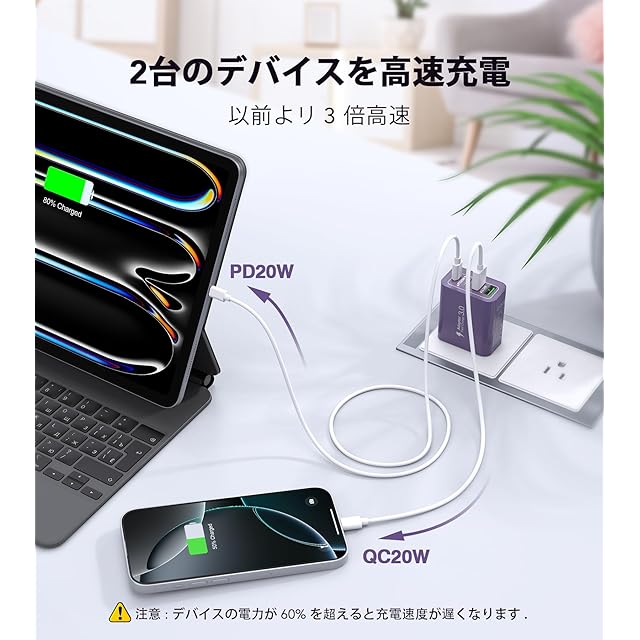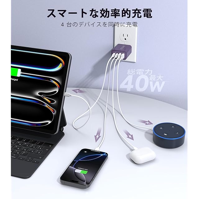 合計40W 急速充電器 USB コンセント Type-C 充電器 ACアダプター USBポート & USB Cポート PD 20W iPhone 充電器 アダプタ タイプc 充電器 USB 電源タップ iPhone iPad Android その他各種機器対応(パープル)