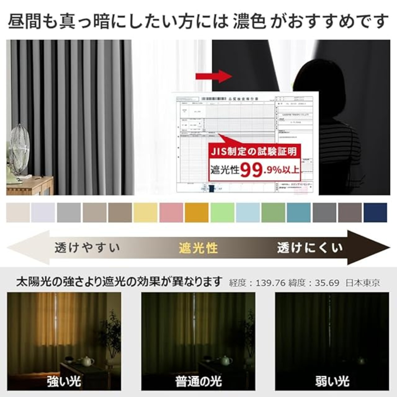 【1級遮光】迷ったらこれ!シンプル&機能性重視の方におすすめです。この4枚セット(1級遮光ドレープカーテン2枚,レースカーテン2枚)を選択する理由:①光沢を抑えたマットな質感が美しい。②黒ずみの少ないなめらかな生地。③快適に過ごせる優れた性能。遮光率99.9%以上、日差しの強い窓でもしっかりと遮光できるので、光をできる限りシャットアウトしたい方におすすめです。
