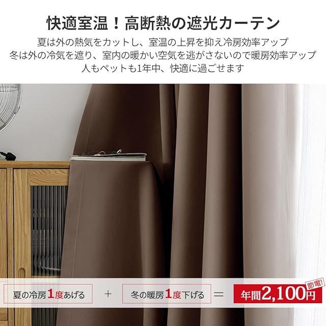 【遮熱保温·形状記憶】届いてすぐ使えるドレープカーテン2枚、同色タッセル付きます。夏は外の熱気をカットし、室温の上昇を抑え冷房効率アップします。冬は外の冷気を遮り、室内の暖かい空気を逃がさないので暖房効率もアップします。ペットにも1年中快適に過ごせます。洗濯機でまるごと洗えます。お手入れしやすいのでいつも清潔に使用できます。カーテンの重みで洗濯ジワも伸ばすことができので、形態安定としてはとても効果が期待できます。
