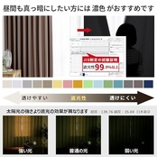 このカーテンは遮光度99.99%以上の「一級遮光」仕様で、外光をほぼ完全に遮断し、昼間でも室内を真っ暗にできます。遮光効果は色によって異なり、濃色ほど遮光性が高まるため、光を徹底的に遮りたい方にはダークカラーがおすすめです。素材は100%ポリエステルの高密度厚地で、遮熱・保温・防音効果に優れ、表裏同色のデザインで使い勝手も良好。三重織り技術により黒系糸を織り込んでおり、紫外線や西日をしっかりカットします。さらに、生地の特性により夏は涼しく、冬は暖かく保ち、冷暖房効率を向上させ光熱費削減にも貢献。洗濯機対応で形崩れしにくく、手入れも簡単です。機能性と実用性を兼ね備えた、年間を通じて活躍する高品質遮光カーテンです。