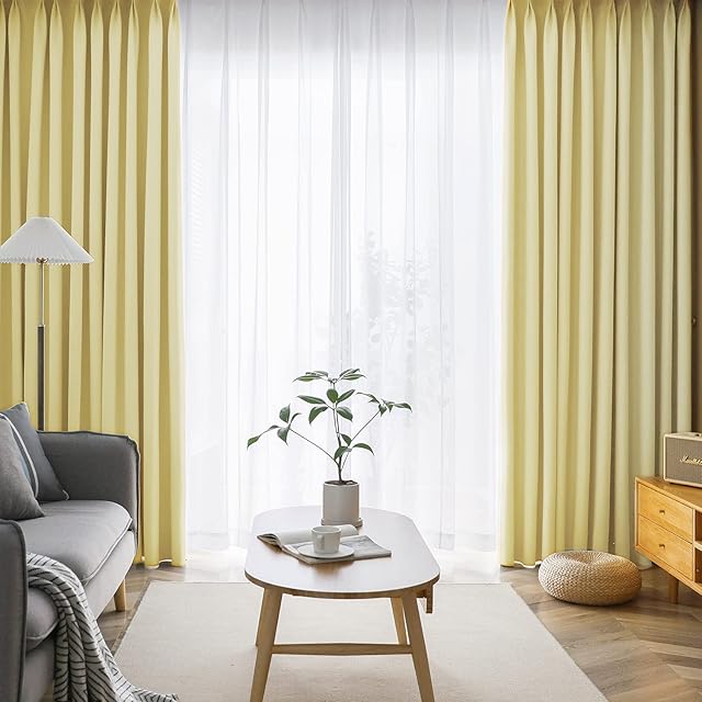 AIFY カーテン 4枚セット 99.9%以上遮光 小窓 ドレープカーテン UVカット 形態記憶加工済み 断熱 節電対策 昼夜目隠し 保温 おしゃれ 洗える 洗濯機対応 (カーテン2枚 レース2枚) 幅100cm×丈220cm ペールイエロー