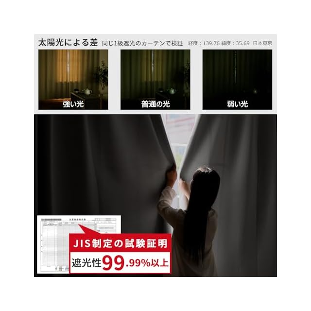 このカーテンは遮光度99.99%以上の「一級遮光」仕様で、外光をほぼ完全に遮断し、昼間でも室内を真っ暗にできます。遮光効果は色によって異なり、濃色ほど遮光性が高まるため、光を徹底的に遮りたい方にはダークカラーがおすすめです。素材は100%ポリエステルの高密度厚地で、遮熱・保温・防音効果に優れ、表裏同色のデザインで使い勝手も良好。三重織り技術により黒系糸を織り込んでおり、紫外線や西日をしっかりカットします。さらに、生地の特性により夏は涼しく、冬は暖かく保ち、冷暖房効率を向上させ光熱費削減にも貢献。洗濯機対応で形崩れしにくく、手入れも簡単です。機能性と実用性を兼ね備えた、年間を通じて活躍する高品質遮光カーテンです。