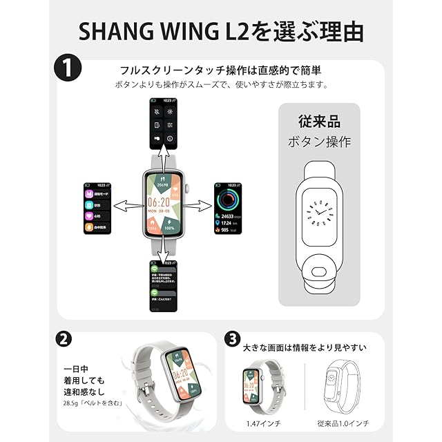 商品名:SHANG WING スマートウォッチ レディース iphone対応 アンドロイド対応 リストバンド型 腕時計 1.47インチ大画面 フルタッチ Smart Watch 着信通知 24時間 女子生理サイクル記録 多種類運動モード 天気予報 IP68防水 文字盤自由設定 誕生日 クリストマス 新年 ギフト 日本語説明書付き Lynn2 グレー