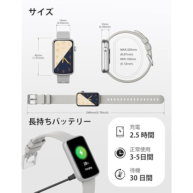 「100+文字盤·座りすぎ通知·生理周期」スマートウォッチ本体に5つの文字盤を搭載。専用アプリで100以上の文字盤をダウンロードできるだけでなく、アルバムや撮影により、お気に入りの写真を文字盤に設定することもでき、毎日気分に合わせたスタイルを楽しめます!専用アプリで座り過ぎのリマインダーの時間帯や間隔を自由に設定し、日常生活に無理なく取り入れられます。体を動かすタイミングを見逃しません。さらに、女性の生理周期を記録する機能では、アプリで生理周期の開始日と終了日を記録することで、次回の予想月経日や排卵日などを予測することができます。
