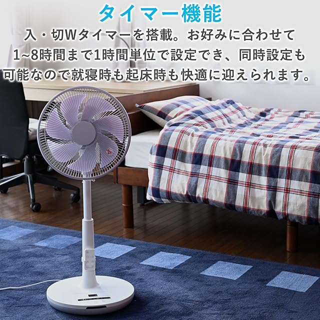 【風量・タイマー設定】風量は12段階と細かく設定できるので、日中・就寝時などシーンに合わせた心地よい風で快適に過ごせます。タイマーは入・切ダブルタイマーを搭載。入切タイマー共に、お好みに合わせて1~8時間まで1時間単位で設定でき、同時設定も可能なので就寝時も起床時も快適に迎えられます。