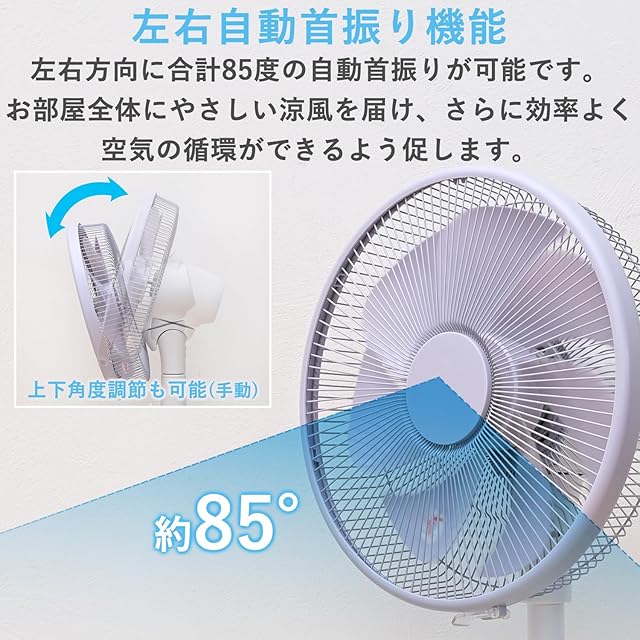 【首振り】左右85度までの自動首振りで広範囲に風をお届けします。また、お部屋の空気循環の効率アップにもつながります。