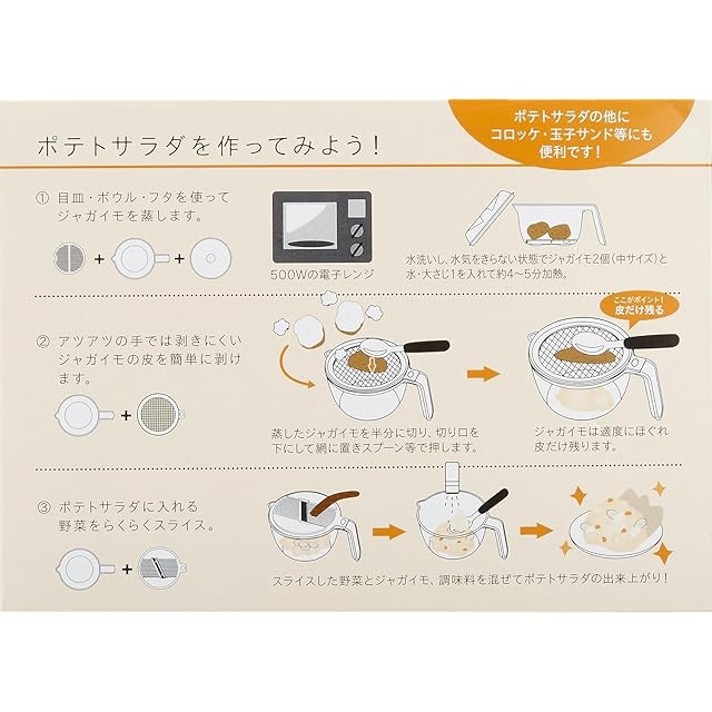 ★これ一つでポテトサラダが簡単に作れる調理ツールのセットです。<br> <br> ★アツアツの手では剥きにくいジャガイモの皮を簡単に剥けます。蒸したじゃがいもを半分に切り、切り口を下にして網に置き、スプーンなどで押します。ジャガイモは適度にほぐれて、皮だけ網の上に残ります。<br> <br> ★ポテトサラダに入れる野菜をらくらくスライス。スライスした野菜をジャガイモを調味料と混ぜてポテトサラダの出来上がり。その他にコロッケ・グラタンなどの下ごしらえにも重宝します。<br> <br> ★コンパクトに積み重ねて収納ができるので、場所を取りません。<br> <br> 【製品仕様】生産地:日本 商品サイズ:約134×190×122mm 商品重量:約223g 素材:ボウル・フタ・目皿・ポリプロピレン、こし網枠・スライサープレート・ABS樹脂、網・ステンレス鋼、刃部・ステンレス刃物鋼 内容:製品本体、RunwayCharmステッカー付(※ステッカーの付属がない場合は当店またはにご連絡ください)商標登録番号:登録第6442206号