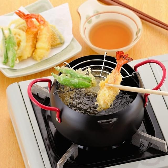 ★鉄製だから天ぷらがカラリと揚がる:食材を入れても急激な温度変化がないのは、厚手でしっかり油を温めるから。油から取り上げたら、すぐ油きりが出来るアミが付いています。お手入れしやすい形状で、長くお使い頂けます。