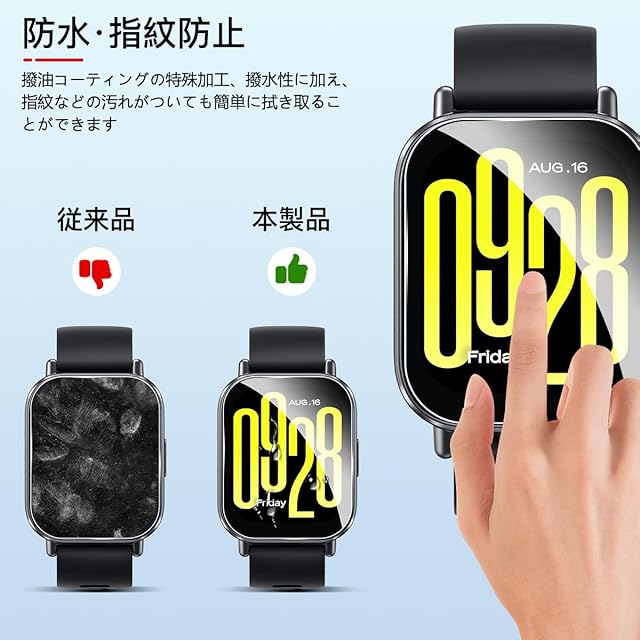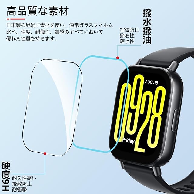 <b>対応機種:対応 Xiaomi Redmi Watch 5 Active 2インチ</b> <br><b>購入前に対応機種をご確認よろしくお願い致します</b> <br><b>パッケージ内容</b> <br>3×強化ガラス保護フィルム<br>3×アルコールパッド<br>3×ダストステッカー<br>1×気泡除去ヘラ<br><b>厚み0.26mmの強化ガラスを使用した、対応 Redmi Watch 5 Active ガラスフィルム。日本製素材旭硝子製を採用しております、9Hの表面硬度を誇る強化ガラス,ナイフに触れても傷つきにくく</b><br><b>【製品特徴】</b> <br>①旭硝子素材硬度9H<br>②貼り付けが可能で、気泡が発生しにくいです<br>③高透過率&高感度タッチ<br>④撥水・撥油加工で指紋や皮脂の付着を防げ<br>⑤2.5D ラウンドエッジ仕様<br><b>【耐久性 安全性】</b> <br>日本製旭硝子素材の採用、9H硬度、強化ガラス 耐衝撃、スクラッチ防止。飛散防止加工、激しい衝撃を受けてもガラスフィルムは貼り付けのままでございます<br><b>【貼り付けやすい】</b> <br>気泡防止 アルコールパッド・クリーニングクロス・静電気ホコリ取りシートを使用することにより 気泡が入りにくく、誰でも簡単に貼り付けることができます<br><b>【99%高透過率】</b> <br>透過率99%超えのフィルムで、液晶画面の鮮明度を損なうことなく画面本来の美しさをそのまま表現,よい手触り感でしかもスムーズな操作感をご体験いただけます<br><b>【指紋防止】</b> <br>指紋防止、飛散防止 撥油コーティング加工されているため、耐油性に優れ、指紋がつきにくく、付着した汚れなどは簡単に拭きとれます<br><b>【スムーズな操作感】</b> <br>高感度タッチ 極薄の厚さでタッチスクリーンの反応を損なわず表面のオイル加工により快適な操作が可能。 <br>スクリーンにタッチするとすぐにフィードバックができます。遅延の心配はありません<br><b>貼り付け方法:</b><br>ステップ1:まず、付属の緑色の「1」ウェットシートでスクリーンに付いた汚れを拭きとります。<br>ステップ2:次に、ピンク色の「2」ドライシートで水滴や指紋などを拭きとります。<br>ステップ3:付属の青色シールを使って、ホコリやごみをきれいに拭きとります。<br>ステップ4:ガラスフィルムを設備に貼ります。揭下透明的胶卷贴纸。液晶の上に軽く置きながら、位置を調整してください。埃が付かないように注意してください。<br>ステップ5:中央から外の方に、押しながら貼り付けます。