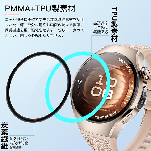商品名:対応 HUAWEI Watch 5 42mm フィルム 画面保護フィルム 【3枚セット】 対応 ファーウェイ Watch 5 42mm 液晶 保護フィルム 柔軟なTPU製 炭素繊維 3D曲面 カバー 24時間自動修復技術 衝撃吸収 高透過率 高感度タッチ 指紋防止 撥油性 疎水性 自動吸着 気泡ゼロ 貼り付け簡単