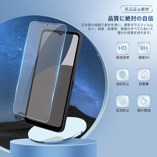 <b>対応機種:対応 AQUOS Wish5 SH-52F / SH-M32</b> <br><b>購入前に対応機種をご確認よろしくお願い致します</b> <br><b>対応 アクオスWish5 ガラスフィルム。日本製素材旭硝子製を採用しております、9Hの表面硬度を誇る強化ガラス,ナイフに触れても傷つきにくく</b><br><b>【製品特徴】</b> <br>①旭硝子素材硬度9H<br>②貼り付けが可能で、気泡が発生しにくいです<br>③高透過率&高感度タッチ<br>④撥水・撥油加工で指紋や皮脂の付着を防げ<br>⑤2.5D ラウンドエッジ仕様<br><b>【耐久性 安全性】</b> <br>日本製旭硝子素材の採用、9H硬度、強化ガラス 耐衝撃、スクラッチ防止。飛散防止加工、激しい衝撃を受けてもガラスフィルムは貼り付けのままでございます<br><b>【貼り付けやすい】</b> <br>専用のガイド枠付きで、正確な位置に完璧に貼り付けることができます、誰でも簡単に貼り付けることができます<br><b>【99%高透過率】</b> <br>透過率99%超えのフィルムで、液晶画面の鮮明度を損なうことなく画面本来の美しさをそのまま表現,よい手触り感でしかもスムーズな操作感をご体験いただけます<br><b>【指紋防止】</b> <br>指紋防止、飛散防止 撥油コーティング加工されているため、耐油性に優れ、指紋がつきにくく、付着した汚れなどは簡単に拭きとれます<br><b>【2.5D加工】</b> <br>2.5Dラウンドエッジ処理でフィルムの角を丸く加工することで、装用時もスマホ角部分の違和感が無く高級感がアップ、 市販の99%の保護ケースと干渉しなく、相性が良いものです。<br><b>【スムーズな操作感】</b> <br>高感度タッチ 極薄の厚さでタッチスクリーンの反応を損なわず表面のオイル加工により快適な操作が可能。スクリーンにタッチするとすぐにフィードバックができます。遅延の心配はありません<br><b>パッケージ内容</b> <br>2×強化ガラス保護フィルム <br>2×カメラフィルム<br>4×ダストステッカー<br>1xガイド枠<br>1x取扱説明書<br><b>貼り付け方法:</b><br>1.スマホ電源をオフにし、保護フィルムとクリーニングクロスなどを取り出してください。<br>2.アルコールパッドを使って液晶画面の汚れを拭き取リます。<br>3.ホコリ取りシートを使って、液晶画面に残ったホコリや布繊維を取り除きます。<br>4.ガイド枠を本体位置に合わせて取り付ける。ホコリ取りシールを再度使用し、ホコリを除去する。<br>5.ガラスフィルムを取り出して、白い台紙を後ろから丁寧に剥がしてください。液晶画面に合うよう慎重にガラスフィルムをのせます。<br>6.保護フィルムを置いた後、指でゆっくりと液晶画面の最初から最後までスライドします。保護フィルムは自動的に端に吸着しますので、少々お待ちください。<br>7.残った気泡をクリーニングクロスで、フィルムの外側に向かって指で押し出すようにして取り除きます。<br>8.貼り付けが完了。クリーニングクロスで液晶画面をよく拭いてください。