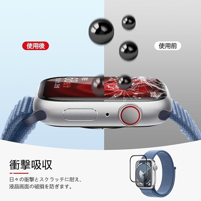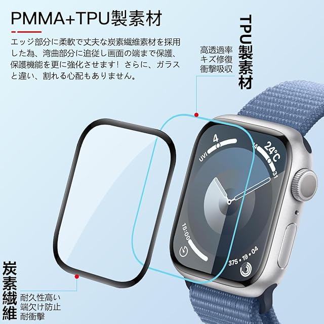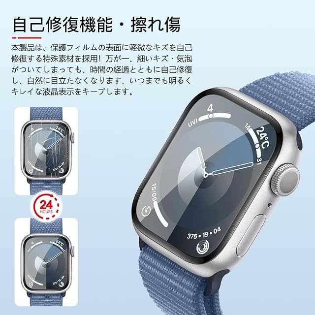 対応機種:対応 Apple Watch Series 9 / 8 / 7 45mm 購入前に対応機種をご確認よろしくお願い致します パッケージ内容 3×全面保護フィルム3×アルコールパッド3×ダストステッカー1x取扱説明書1x気泡除去ヘラ非常に柔らかいウレタン素材を採用する事により、湾曲部分に追従し画面の端まで保護することができ、Apple Watch Series 9独自のデザインを損なわず、まるでフィルムを貼ってないような仕上がりになります【製品特徴】 高品質のTPU素材②貼り付けが可能で、気泡が発生しにくいです③高透過率&高感度タッチ④撥水・撥油加工で指紋や皮脂の付着を防げ⑤キズ修復機能【柔らかいTPU素材】PMMA+TPU製素材、エッジ部分に柔軟で丈夫な炭素繊維素材を採用した為、湾曲部分に追従し画面の端まで保護、保護機能を更に強化させますさらに、ガラスと違い、割れる心配もありません【キズレスと気泡レス】優れた伸縮性を持っていて、フィルム表面の細いキズと貼り付け時に小さい気泡が発生てしまった場合、通常24時間内で消えます【貼り付けやすい】 気泡防止 アルコールパッド・クリーニングクロス・静電気ホコリ取りシートを使用することにより 気泡が入りにくく、誰でも簡単に貼り付けることができます【99%高透過率】 透過率99%超えのフィルムで、液晶画面の鮮明度を損なうことなく画面本来の美しさをそのまま表現,よい手触り感でしかもスムーズな操作感をご体験いただけます【指紋防止】 指紋防止、撥油コーティング加工されているため、耐油性に優れ、指紋がつきにくく、付着した汚れなどは簡単に拭きとれます【3D設計】 画面の曲面に沿った3D設計で、端末のデザインを損なわずに衝撃から守るフルカバーフィルム、 市販の99%の保護ケースと干渉しなく、相性が良いものです【スムーズな操作感】 高感度タッチ 極薄の厚さでタッチスクリーンの反応を損なわず表面のオイル加工により快適な操作が可能スクリーンにタッチするとすぐにフィードバックができます遅延の心配はありません貼り付け方法:ステップ1:アルコールパッドを使ってスクリーンの汚れを拭き取リますその後、乾いた布でスクリーンをさらに徹底的にぬぐい取ってください[1]はアルコールパック[2]は乾いた布ステップ2:ダストステッカー(ホコリ除去シール)で軽く叩いて、スクリーンに残っている小さなホコリを取り除きますステップ3:保護フィルムを分離するために底部キャリアシートを曲げますホコリがつかないように注意してくさい4:保護フィルムを液晶画面に合わせてゆっくりと貼り付けてくださいステップ5:保護フィルムの中央を軽く押して、液晶画面に自動的に吸着させます、さらに気泡除去ヘラで余分な気泡を拭き取るステップ6:貼り付けてから、再度クロスで保護フィルムを拭きます