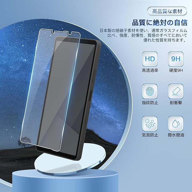 <b>対応機種:対応 Xperia 10 VII SO-52F / SOG16 / A502SO / XQ-FE44</b> <br><b>購入前に対応機種をご確認よろしくお願い致します</b> <br><b>対応 エクスペリア10 vii ガラスフィルム。日本製素材旭硝子製を採用しております、9Hの表面硬度を誇る強化ガラス,ナイフに触れても傷つきにくく</b><br><b>【製品特徴】</b> <br>①旭硝子素材硬度9H<br>②貼り付けが可能で、気泡が発生しにくいです<br>③高透過率&高感度タッチ<br>④撥水・撥油加工で指紋や皮脂の付着を防げ<br>⑤2.5D ラウンドエッジ仕様<br><b>【耐久性 安全性】</b> <br>日本製旭硝子素材の採用、9H硬度、強化ガラス 耐衝撃、スクラッチ防止。飛散防止加工、激しい衝撃を受けてもガラスフィルムは貼り付けのままでございます<br><b>【貼り付けやすい】</b> <br>専用のガイド枠付きで、正確な位置に完璧に貼り付けることができます、誰でも簡単に貼り付けることができます<br><b>【99%高透過率】</b> <br>透過率99%超えのフィルムで、液晶画面の鮮明度を損なうことなく画面本来の美しさをそのまま表現,よい手触り感でしかもスムーズな操作感をご体験いただけます<br><b>【指紋防止】</b> <br>指紋防止、飛散防止 撥油コーティング加工されているため、耐油性に優れ、指紋がつきにくく、付着した汚れなどは簡単に拭きとれます<br><b>【2.5D加工】</b> <br>2.5Dラウンドエッジ処理でフィルムの角を丸く加工することで、装用時もスマホ角部分の違和感が無く高級感がアップ、 市販の99%の保護ケースと干渉しなく、相性が良いものです。<br><b>【スムーズな操作感】</b> <br>高感度タッチ 極薄の厚さでタッチスクリーンの反応を損なわず表面のオイル加工により快適な操作が可能。スクリーンにタッチするとすぐにフィードバックができます。遅延の心配はありません<br><b>パッケージ内容</b> <br>2×強化ガラス保護フィルム <br>2×カメラフィルム<br>4×ダストステッカー<br>1xガイド枠<br>1x取扱説明書<br><b>貼り付け方法:</b><br>1.スマホ電源をオフにし、保護フィルムとクリーニングクロスなどを取り出してください。<br>2.アルコールパッドを使って液晶画面の汚れを拭き取リます。<br>3.ホコリ取りシートを使って、液晶画面に残ったホコリや布繊維を取り除きます。<br>4.ガイド枠を本体位置に合わせて取り付ける。ホコリ取りシールを再度使用し、ホコリを除去する。<br>5.ガラスフィルムを取り出して、白い台紙を後ろから丁寧に剥がしてください。液晶画面に合うよう慎重にガラスフィルムをのせます。<br>6.保護フィルムを置いた後、指でゆっくりと液晶画面の最初から最後までスライドします。保護フィルムは自動的に端に吸着しますので、少々お待ちください。<br>7.残った気泡をクリーニングクロスで、フィルムの外側に向かって指で押し出すようにして取り除きます。<br>8.貼り付けが完了。クリーニングクロスで液晶画面をよく拭いてください。