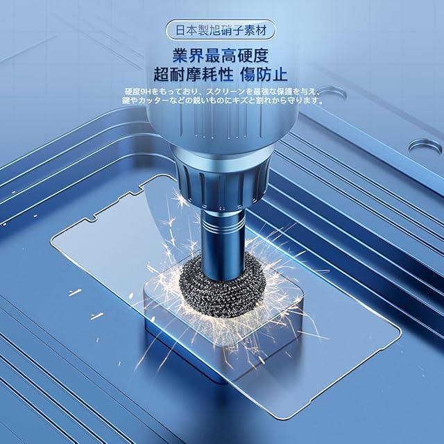 ★【業界最高硬度・耐衝撃性!】 日本製旭硝子素材を採用し、硬度 9H の超強化ガラスにハードコーティング技術を施しています。1 メートルの高さから 10kg の荷重を 30 回繰り返し落下させる過酷な試験に合格した実績を持ち、日常生活で遭遇するキーやカッター、コインなどの鋭い物による傷からも端末をしっかり保護します。 さらに、飛散防止加工により、万一ガラスが破損した場合でも破片が飛び散ることを防ぎ、破片はほぼ固定された状態を維持するため、使用者の安全を確実にサポートします。