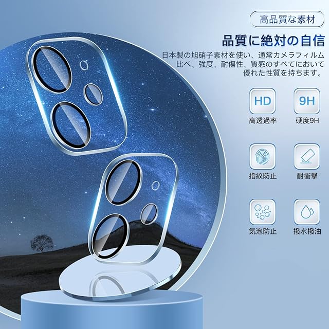 対応機種:対応 iphone12 購入前に対応機種をご確認よろしくお願い致します パッケージ内容 2×強化カメラ保護フィルム2×アルコールパッド2×ダストステッカー1x取扱説明書厚み0.26mmの強化ガラスを使用した、対応 アイフォン12 レンズフィルム日本製素材旭硝子製を採用しております、9Hの表面硬度を誇る強化ガラス,ナイフに触れても傷つきにくく【製品特徴】 旭硝子素材硬度9H②貼り付けが可能で、気泡が発生しにくいです③高透過率&露出オーバー防止④撥水・撥油加工で指紋や皮脂の付着を防げ⑤2.5D ラウンドエッジ仕様【耐久性 安全性】 日本製旭硝子素材の採用、9H硬度、強化ガラス 耐衝撃、スクラッチ防止飛散防止加工、激しい衝撃を受けてもカメラフィルムは貼り付けのままでございます【貼り付けやすい】 気泡防止 アルコールパッド・クリーニングクロス・静電気ホコリ取りシートを使用することにより 気泡が入りにくく、誰でも簡単に貼り付けることができます【99%高透過率】 透過率99%超えのフィルムで、液晶画面の鮮明度を損なうことなく画面本来の美しさをそのまま表現【指紋防止】 指紋防止、飛散防止 撥油コーティング加工されているため、耐油性に優れ、指紋がつきにくく、付着した汚れなどは簡単に拭きとれますパッケージ内容 2×強化カメラ保護フィルム2×アルコールパッド2×ダストステッカー1x取扱説明書貼り付け方法:ステップ1:まず、付属の緑色の「1」ウェットシートでスマートフォン用レンズに付いた汚れを拭きとりますステップ2:次に、ピンク色の「2」ドライシートで水滴や指紋などを拭きとりますステップ3:付属の青色シールを使って、ホコリやごみをきれいに拭きとりますステップ4:カメラフィルムをスマートフォン用レンズに貼ります揭下透明的胶卷贴纸スマートフォン用レンズの上に軽く置きながら、位置を調整してください埃が付かないように注意してくださいステップ5:中央から外の方に、押しながら貼り付けます