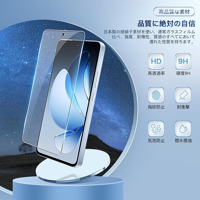 <b>対応機種:対応 OPPO Reno13A</b> <br><b>購入前に対応機種をご確認よろしくお願い致します</b> <br><b>対応 Reno13 A ガラスフィルム。日本製素材旭硝子製を採用しております、9Hの表面硬度を誇る強化ガラス,ナイフに触れても傷つきにくく</b><br><b>【製品特徴】</b> <br>①旭硝子素材硬度9H<br>②貼り付けが可能で、気泡が発生しにくいです<br>③高透過率&高感度タッチ<br>④撥水・撥油加工で指紋や皮脂の付着を防げ<br>⑤2.5D ラウンドエッジ仕様<br><b>【耐久性 安全性】</b> <br>日本製旭硝子素材の採用、9H硬度、強化ガラス 耐衝撃、スクラッチ防止。飛散防止加工、激しい衝撃を受けてもガラスフィルムは貼り付けのままでございます<br><b>【貼り付けやすい】</b> <br>専用のガイド枠付きで、正確な位置に完璧に貼り付けることができます、誰でも簡単に貼り付けることができます<br><b>【99%高透過率】</b> <br>透過率99%超えのフィルムで、液晶画面の鮮明度を損なうことなく画面本来の美しさをそのまま表現,よい手触り感でしかもスムーズな操作感をご体験いただけます<br><b>【指紋防止】</b> <br>指紋防止、飛散防止 撥油コーティング加工されているため、耐油性に優れ、指紋がつきにくく、付着した汚れなどは簡単に拭きとれます<br><b>【2.5D加工】</b> <br>2.5Dラウンドエッジ処理でフィルムの角を丸く加工することで、装用時もスマホ角部分の違和感が無く高級感がアップ、 市販の99%の保護ケースと干渉しなく、相性が良いものです。<br><b>【スムーズな操作感】</b> <br>高感度タッチ 極薄の厚さでタッチスクリーンの反応を損なわず表面のオイル加工により快適な操作が可能。スクリーンにタッチするとすぐにフィードバックができます。遅延の心配はありません<br><b>パッケージ内容</b> <br>2×強化ガラス保護フィルム <br>2×カメラフィルム<br>4×ダストステッカー<br>1xガイド枠<br>1x取扱説明書<br><b>貼り付け方法:</b><br>1.スマホ電源をオフにし、保護フィルムとクリーニングクロスなどを取り出してください。<br>2.アルコールパッドを使って液晶画面の汚れを拭き取リます。<br>3.ホコリ取りシートを使って、液晶画面に残ったホコリや布繊維を取り除きます。<br>4.ガイド枠を本体位置に合わせて取り付ける。ホコリ取りシールを再度使用し、ホコリを除去する。<br>5.ガラスフィルムを取り出して、白い台紙を後ろから丁寧に剥がしてください。液晶画面に合うよう慎重にガラスフィルムをのせます。<br>6.保護フィルムを置いた後、指でゆっくりと液晶画面の最初から最後までスライドします。保護フィルムは自動的に端に吸着しますので、少々お待ちください。<br>7.残った気泡をクリーニングクロスで、フィルムの外側に向かって指で押し出すようにして取り除きます。<br>8.貼り付けが完了。クリーニングクロスで液晶画面をよく拭いてください。