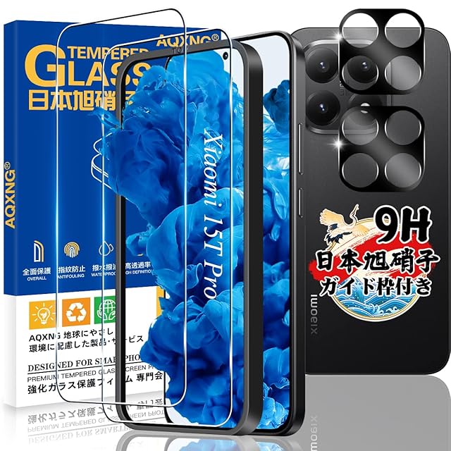 【ガイド枠付き 指紋認証対応】 対応 Xiaomi 15T Pro ガラスフィルム 2枚 + カメラ保護 2枚 【4枚セット 日本旭硝子製】 対応 シャオミ 15T Pro フィルム 強化ガラス Xiaomi15T Pro 用 保護フィルム ケース 硬度9H 耐衝撃 高感度タッチ 指紋防止 自動吸着 気泡ゼロ 貼り付け簡単
