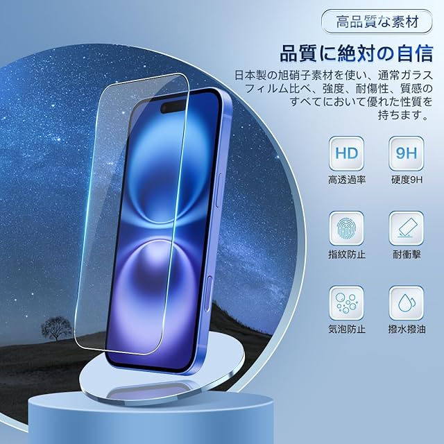 <b>対応機種:対応 iPhone 16</b> <br><b>購入前に対応機種をご確認よろしくお願い致します</b> <br><b>厚み0.26mmの強化ガラスを使用した、対応 いPhone16 ガラスフィルム。日本製素材旭硝子製を採用しております、9Hの表面硬度を誇る強化ガラス,ナイフに触れても傷つきにくく</b><br><b>【製品特徴】</b> <br>①旭硝子素材硬度9H<br>②貼り付けが可能で、気泡が発生しにくいです<br>③高透過率&高感度タッチ<br>④撥水・撥油加工で指紋や皮脂の付着を防げ<br>⑤2.5D ラウンドエッジ仕様<br><b>【耐久性 安全性】</b> <br>日本製旭硝子素材の採用、9H硬度、強化ガラス 耐衝撃、スクラッチ防止。飛散防止加工、激しい衝撃を受けてもガラスフィルムは貼り付けのままでございます<br><b>【貼り付けやすい】</b> <br>専用のガイド枠付きで、正確な位置に完璧に貼り付けることができます、誰でも簡単に貼り付けることができます<br><b>【99%高透過率】</b> <br>透過率99%超えのフィルムで、液晶画面の鮮明度を損なうことなく画面本来の美しさをそのまま表現,よい手触り感でしかもスムーズな操作感をご体験いただけます<br><b>【指紋防止】</b> <br>指紋防止、飛散防止 撥油コーティング加工されているため、耐油性に優れ、指紋がつきにくく、付着した汚れなどは簡単に拭きとれます<br><b>【2.5D加工】</b> <br>2.5Dラウンドエッジ処理でフィルムの角を丸く加工することで、装用時もスマホ角部分の違和感が無く高級感がアップ、 市販の99%の保護ケースと干渉しなく、相性が良いものです。<br><b>【スムーズな操作感】</b> <br>高感度タッチ 極薄の厚さでタッチスクリーンの反応を損なわず表面のオイル加工により快適な操作が可能。スクリーンにタッチするとすぐにフィードバックができます。遅延の心配はありません<br><b>パッケージ内容</b> <br>2×強化ガラス保護フィルム <br>2×カメラフィルム<br>4×ダストステッカー<br>1xガイド枠<br>1x取扱説明書<br><b>貼り付け方法:</b><br>1.スマホ電源をオフにし、保護フィルムとクリーニングクロスなどを取り出してください。<br>2.アルコールパッドを使って液晶画面の汚れを拭き取リます。<br>3.ホコリ取りシートを使って、液晶画面に残ったホコリや布繊維を取り除きます。<br>4.ガイド枠を本体位置に合わせて取り付ける。ホコリ取りシールを再度使用し、ホコリを除去する。<br>5.ガラスフィルムを取り出して、白い台紙を後ろから丁寧に剥がしてください。液晶画面に合うよう慎重にガラスフィルムをのせます。<br>6.保護フィルムを置いた後、指でゆっくりと液晶画面の最初から最後までスライドします。保護フィルムは自動的に端に吸着しますので、少々お待ちください。<br>7.残った気泡をクリーニングクロスで、フィルムの外側に向かって指で押し出すようにして取り除きます。<br>8.貼り付けが完了。クリーニングクロスで液晶画面をよく拭いてください。