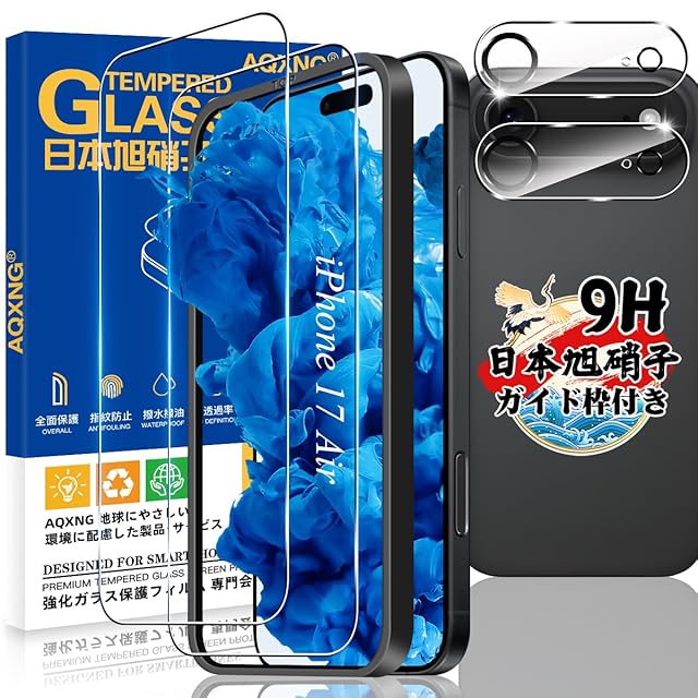 【ガイド枠付き】 対応 iPhone 17 Air ガラスフィルム 2枚 + カメラ保護 2枚 【4枚セット 日本旭硝子製】 いphone17Air 用 フィルム 強化ガラス アイホン17Air 用 保護フィルム ケース 硬度9H 耐衝撃 飛散防止 高感度タッチ 指紋防止 撥油性 疎水性 自動吸着 気泡ゼロ 貼り付け簡単