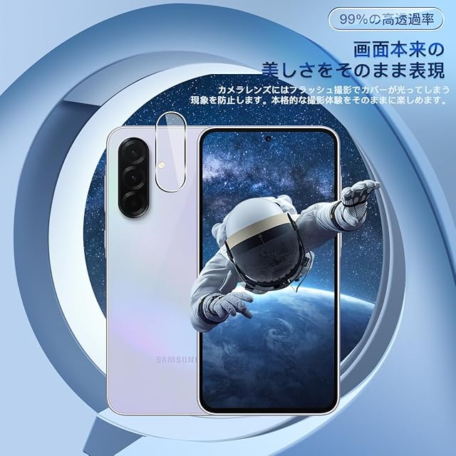 <b>対応機種:対応 Galaxy A36 5G</b> <br><b>購入前に対応機種をご確認よろしくお願い致します</b> <br><b>パッケージ内容</b> <br>2×強化カメラ保護フィルム<br>2×ダストステッカー<br>1x取扱説明書<br><b>厚み0.26mmの強化ガラスを使用した、対応 ギャラクシー A36 5G レンズフィルム。日本製素材旭硝子製を採用しております、9Hの表面硬度を誇る強化ガラス,ナイフに触れても傷つきにくく</b><br><b>【製品特徴】</b> <br>①旭硝子素材硬度9H<br>②貼り付けが可能で、気泡が発生しにくいです<br>③高透過率&露出オーバー防止<br>④撥水・撥油加工で指紋や皮脂の付着を防げ<br>⑤2.5D ラウンドエッジ仕様<br><b>【耐久性 安全性】</b> <br>日本製旭硝子素材の採用、9H硬度、強化ガラス 耐衝撃、スクラッチ防止。飛散防止加工、激しい衝撃を受けてもカメラフィルムは貼り付けのままでございます<br><b>【貼り付けやすい】</b> <br>気泡防止 アルコールパッド・クリーニングクロス・静電気ホコリ取りシートを使用することにより 気泡が入りにくく、誰でも簡単に貼り付けることができます<br><b>【99%高透過率】</b> <br>透過率99%超えのフィルムで、液晶画面の鮮明度を損なうことなく画面本来の美しさをそのまま表現。<br><b>【指紋防止】</b> <br>指紋防止、飛散防止 撥油コーティング加工されているため、耐油性に優れ、指紋がつきにくく、付着した汚れなどは簡単に拭きとれます<br><b>パッケージ内容</b> <br>2×強化カメラ保護フィルム<br>1x取扱説明書<br><b>貼り付け方法:</b><br>ステップ1:まず、付属の緑色の「1」ウェットシートでスマートフォン用レンズに付いた汚れを拭きとります。<br>ステップ2:次に、ピンク色の「2」ドライシートで水滴や指紋などを拭きとります。<br>ステップ3:付属の青色シールを使って、ホコリやごみをきれいに拭きとります。<br>ステップ4:カメラフィルムをスマートフォン用レンズに貼ります。揭下透明的胶卷贴纸。スマートフォン用レンズの上に軽く置きながら、位置を調整してください。埃が付かないように注意してください。<br>ステップ5:中央から外の方に、押しながら貼り付けます。