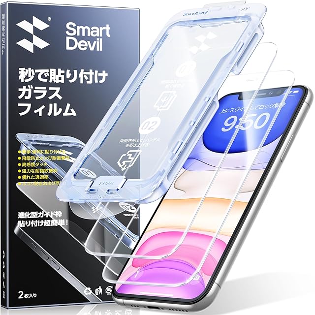 製品について: 「画期的なガイド枠」SmartDevil ガラスフィルム いphone11/XR 用 ガラスフィルム 貼り付け超簡単 0.3mm極薄 米軍MIL規格 落下保護 気泡ゼロ スムーズ 高感度タッチ 指紋防止 耐衝撃性 アイフォン11/XR iphone 11/XR用 強化ガラス 2枚セット 商品の情報: 対応機種:iPhone11/XR 材料:9Hガラス 商品サイズ:6.1 インチ 製品サイズ:14.3cm×6.8cm 付属品:強化ガラスフィルム×2、進化型ガイド枠×1、補助ツールキット×2,取扱説明書×1 期間:365日間 機能: 1.耐衝撃性と耐摩耗性 2.抜群な透明感 3.スムーズと高感度タッチ 4.撥水、防水、指紋防止、飛散防止 5.気泡ゼロ、ホコリゼロ、ズレセロ 6.貼り付け超簡単 Q&A: 1.上手く貼れるか心配ですが、こちら気泡が残りますか。気泡って入らないんですか。 気泡は残らない商品です。いphone11/XR 用ガラスフィルムの貼り付けは、とても簡単にできます。気泡ができても慌てずにじっくりと指で押し出すだけで綺麗に貼れます。結論から言えば多少の気泡は後から擦って出せばよくそれでも多少は残りますが自然と出るようです。気泡ができた場合は指の腹でゆっくり押し出せば綺麗に抜けるので大丈夫ですよ。 2.初めて自分でガラスフィルムを貼ろうと思っているんですが、このiphone 11/XR 用ガラスフィルムは初心者に向いているのでしょうか? 貼り付け簡単です。ガイド枠やクロスやアルコールパッド、ほこり取りシール等、十分なキットも付属品としてセットされておりました。説明書も日本語でわかりやすいです(貼り方の動画のQRコード付き)! 3.iphone11/XR 用ガラスフィルム本体は全て透明ですか?黒色などでガラスフィルムを縁取りしてませんか? この11/XR 用ガラスフィルムは縁取りされていません。端まで3~5mmの隙間があり、端まで覆われません。外装用のケース向けで、外装カバーと併用して、あえて全体を覆わない仕様にしています。4.この11/XR 用ガラスフィルムが指紋(手垢)はどの程度残りますか? 初めのうちは全然気にならないくらい指紋はつきません。使っているうちに少しついてきますが乾拭きで消えるので問題ないです。よほど脂のついた指で触らない限り気にならないです。