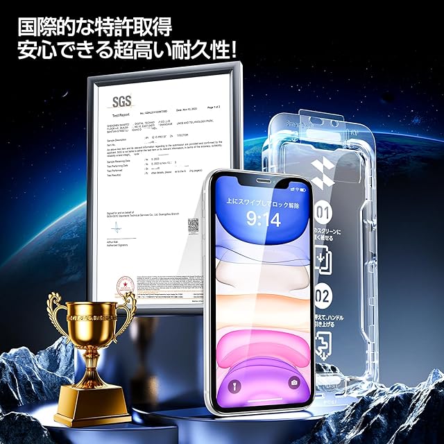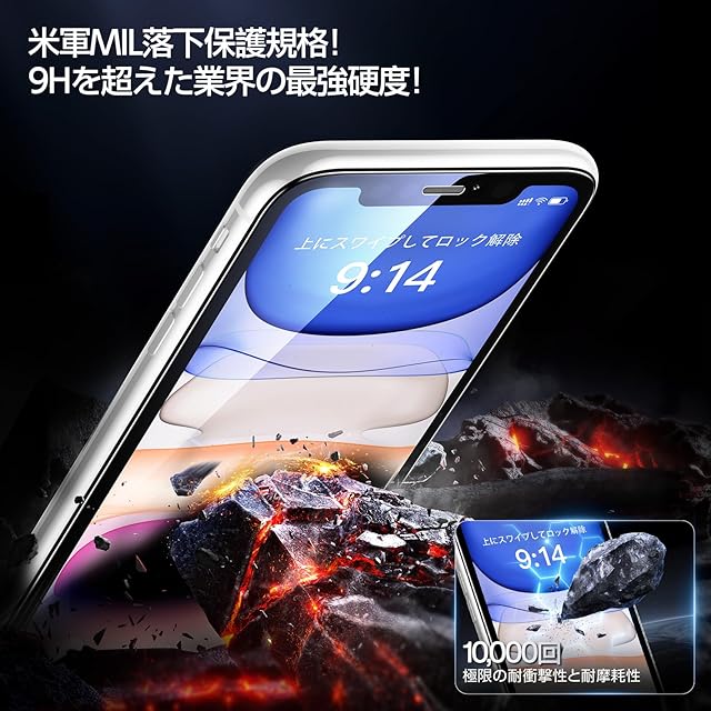 【業界最強の硬度水準・5倍以上の耐衝撃と耐摩耗性】SGS米軍落下保護規格の認証を取得しました!※米軍「MIL-STD-810H」規格認証番号:GZHL2311040506SD|Nov 20,2023 iphone 11/XR 用ガラスフィルムは、二次強化硬度と7層の複合構造で、超高温Na+/k+イオン交換技術など、多くの画期的な加工技術を採用し、9Hの硬度を超えるモース硬度5を実現します。10,000回の極限耐摩耗性テストで、小刀や鍵などの鋭利な物品でも擦り傷が付かられないです!また、厚い発散防止緩衝層によって、衝撃吸収を最大化し、破片が落ちたり飛び散ったりしなくて、お客様のiphone11/XRスマホの画面を本当に保護し、絶対的な安心感を提供いたします!