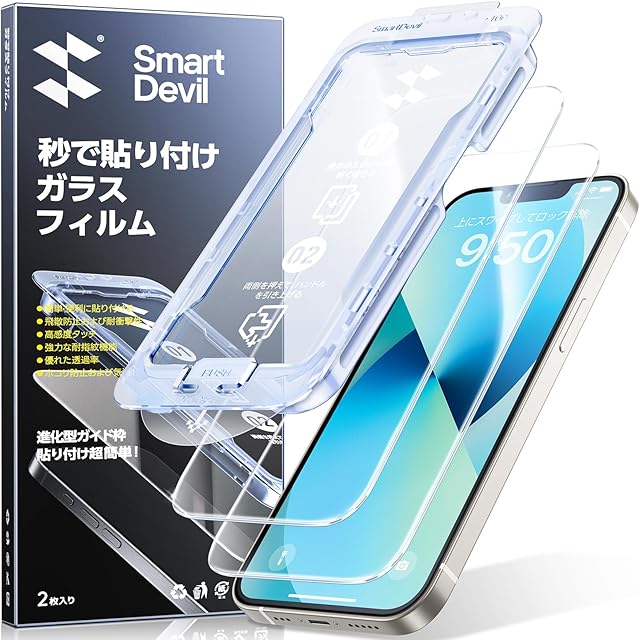 「画期的なガイド枠」SmartDevil いphone13mini用 ガラスフィルム 貼り付け超簡単 0.3mm極薄 米軍MIL規格 落下保護 気泡ゼロ スムーズ 高感度タッチ 指紋防止 耐衝撃性 アイフォン13mini 用強化ガラス 2枚セット 1.超簡単に貼り付け:進化型ガイド枠でスマホの画面に被せてホコリ除去シートを引っ張ります。初心者でも完璧に貼り付けできます!ホコリ除去シートが自動的にホコリを吸着し、貼付け時の失敗が大幅に軽減され、より安心してご利用いただけます! 2.スマホケースと併用可能:SmartDevilのスマホ保護フィルムは、iphone 13mini のフルスクリーンに完璧にフィットします。100%スマホケースと干渉することなく、完全に対応しています。お客様のスマホ画面をしっかり守るできます! 商品の情報: 対応機種:iPhone 13mini 材料:9Hガラス 画面サイズ:6.1 インチ 製品サイズ:14.3L x 6.8W cm 付属品:強化ガラスフィルム×2、進化型ガイド枠×1、補助ツールキット×2,取扱説明書×1 期間:365日間 iPhone13mini 保護フィルム機能: 1.耐衝撃性と耐摩耗性 2.抜群な透明感 3.スムーズと高感度タッチ 4.撥水、防水、指紋防止、飛散防止 5.気泡ゼロ、ホコリゼロ、ズレセロ 6.貼り付け超簡単 Q&A: 1.上手く貼れるか心配ですが、こちら気泡が残りますか。気泡って入らないんですか。 気泡は残らない商品です。iphone 13mini用ガラスフィルムの貼り付けは、とても簡単にできます。気泡ができても慌てずにじっくりと指で押し出すだけで綺麗に貼れます。結論から言えば多少の気泡は後から擦って出せばよくそれでも多少は残りますが自然と出るようです。気泡ができた場合は指の腹でゆっくり押し出せば綺麗に抜けるので大丈夫ですよ。 2.初めて自分でガラスフィルムを貼ろうと思っているんですが、このiphone 13mini 用ガラスフィルムは初心者に向いているのでしょうか? 貼り付け簡単です。ガイド枠やクロスやアルコールパッド、ほこり取りシール等、十分なキットも付属品としてセットされておりました。説明書も日本語でわかりやすいです(貼り方の動画のQRコード付き)! 3.このいphone 13mini用ガラスフィルムが指紋(手垢)はどの程度残りますか? 初めのうちは全然気にならないくらい指紋はつきません。使っているうちに少しついてきますが乾拭きで消えるので問題ないです。よほど脂のついた指で触らない限り気にならないです