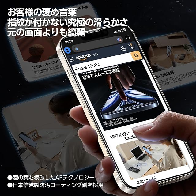 【究極のスムーズな感触・指紋防止】ハスの葉を模倣したAFテクノロジーや日本信越製防汚コーティング剤を採用し、耐水性、耐油性、耐指紋性を持つ防汚ナノコーティングが形成され、指紋を気にすることなく日常的に使用し、画面を綺麗に保つできます。極限摩擦を10,000回繰り返しても、究極の滑らかな高感度タッチを保ち続けます。1億3700万人を超えるユーザーから絶賛され、非常に優れたご利用体験となっております。実物機種で1:1ベースの金型製作に基づいて、iPhone 13 miniのための最も適した強化ガラスフィルムで、貼付け時の失敗が大幅に軽減されます。