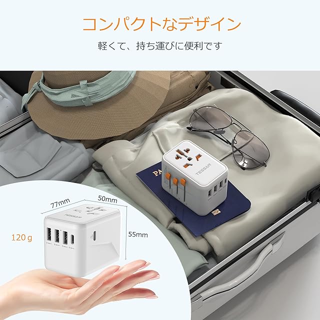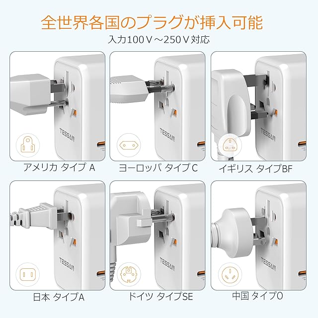 商品名:TESSAN 変換プラグ 海外 コンセント 45W 急速充電 海外旅行用 全世界対応 マルチ変換プラグ C/BF/O/Aタイプ 3つUSB-Aと2つUSB-Cポート付き ヨーロッパ/韓国/イギリス/アメリカ/オーストラリア/中国などの国に対応