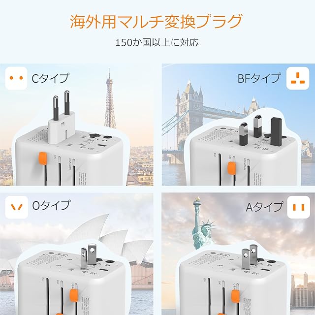 【全世界対応コンセント】内蔵のUS/UK/EUR/AUS(Aタイプ/BFタイプ/Cタイプ/Oタイプ)プラグによって、この電源変換プラグは多数の国のコンセントに対応できます。韓国、イギリス、シンガポール、オーストラリア、カナダ、ヨーロッパ、中国、アメリカ、東南アジアなどの150カ国・地域へ旅行する際に役立って、簡単に使用できます。