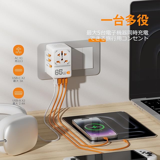 本体にCタイプ・BFタイプ・Oタイプ・Aタイプからなる4種類の変換プラグを内蔵して、韓国、イギリス、ヨーロッパ、オーストラリア、中国、アメリカ、アイルランドなどの世界200カ国・地域以上で使用できます。海外旅行や海外出張への際に便利です。 急速充電機能を搭載し、PD3.0、QC4+、PPS、FCP、SCP、AFCなどに対応。 先進のGaNテクノロジーを採用することで、よりコンパクトになり、効率性と放熱性が向上しています。USB-A1ポート出力:15W~60W、単ポート出力:60W MAX USB-A2ポート出力:5W USB-C1ポート出力:15W~60W、単ポート出力:65W MAX USB-C2ポート出力:45W~60W、単ポート出力:65W MAX