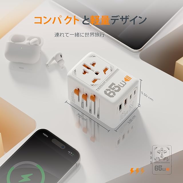 商品名:海外 コンセント変換プラグ 全世界対応 GaN 65W PD 急速充電 TESSAN 海外旅行用 コンセント 2USB-Aと2USB-Cポート付き 1AC口 BF O A Cタイプ ヨーロッパ/韓国/イギリス/アメリカ/オーストラリア/中国などの国に対応