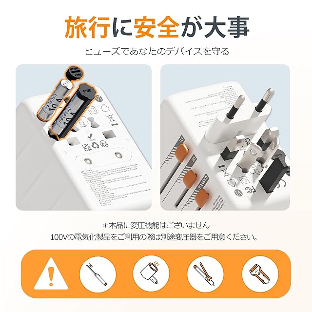 【電源変換プラグ使用時の注意】本製品は変圧器機能はありません。接続する機器が100V~240V対応であることをご確認ください。日本国内専用(AC100V)のヘアドライヤーやシェーバーを使用する場合は、別途変圧器をご用意ください。また、最大電力は110Vで1100W、250Vで2500Wまで対応しています。※海外専用で、日本に適用しない。予めご了承ください。
