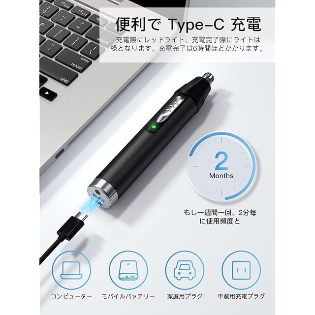 【Type-C 鼻毛カッター メンズ 充電式】乾電池と決別し、耐久性の高い内蔵バッテリーを採用しております、USBの充電ポート(ケーブル付属)により、モバイル電源やパソコン、USBカーチャージャーにいつでも接続でき、持ち運びに便利です。 鼻毛剃り アップグレードされたモーターは、よりパワフルでありながら消費電力が少なく、まゆげ シェーバー メンズは一回充電すると、2ヶ月ほど使用することが出来ます。スマートアラート機能付きで、充電完了際にインジケーターランプが赤から緑に変化します。