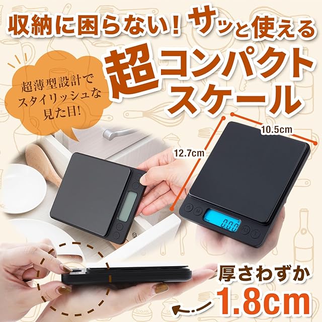 ✅【超コンパクト】 本体サイズ127×106×18mm 重量約275g 厚さ1.8cm。同梱物:キッチンスケール本体・透明カバー、単四電池2個、日本語取扱説明書。デジタルスケールのカバーには、保護フィルムがあり、ご使用時は剥がしてお使いください。また、必ずクッキングスケールのカバーを外して計量ください。※保護フイルムやカバーを外さないと正確に測れません。